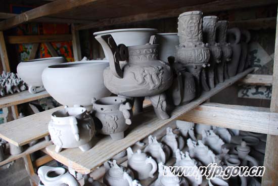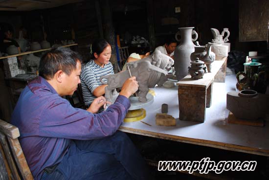 近日,记者在位于平塘县牙舟镇的“牙舟古陶坊”看到,陶艺工人们正在紧张工作着,有的注浆、有的拉坯、有的围着一件件刚成模型的陶器精心雕刻着,一派繁忙景象。据“平塘牙舟古陶坊”主人张禄祺介绍,这是他们为了抓住即将到来的“首届黔南州旅游发展大会暨中国·平塘世界地质奇观旅游节”这一难得商机,加班加点制作生产新产品,争取出窑更多的牙舟陶器在旅发大会期间参展销售。